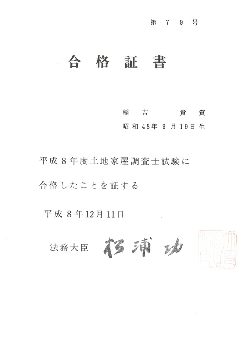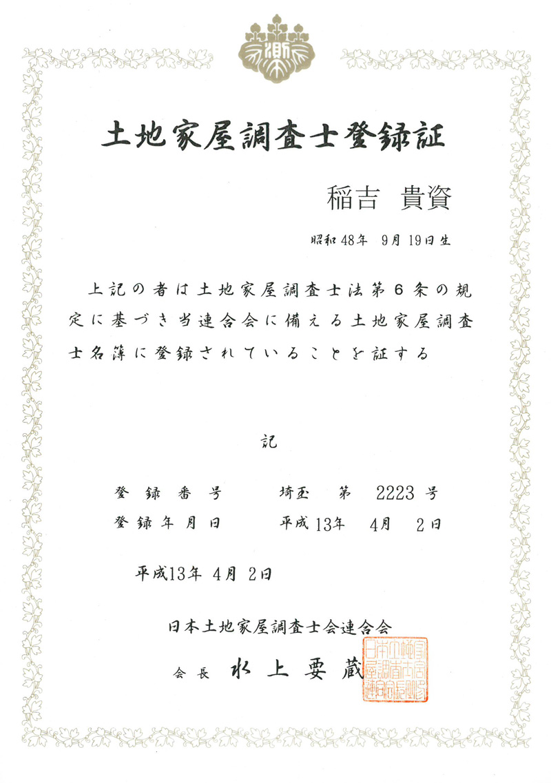 土地家屋調査士 稲吉貴資 平成13年 登録番号 2223号