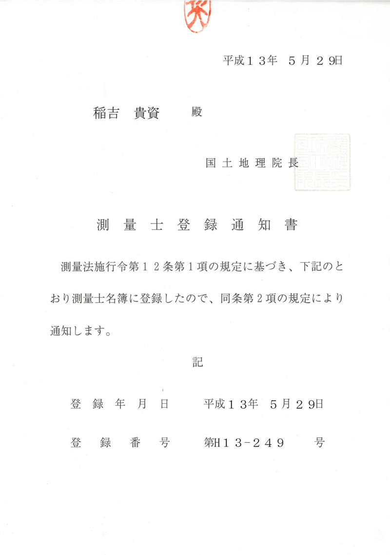 - 測量士 稲吉貴資 平成13年 登録番号 H13-249号