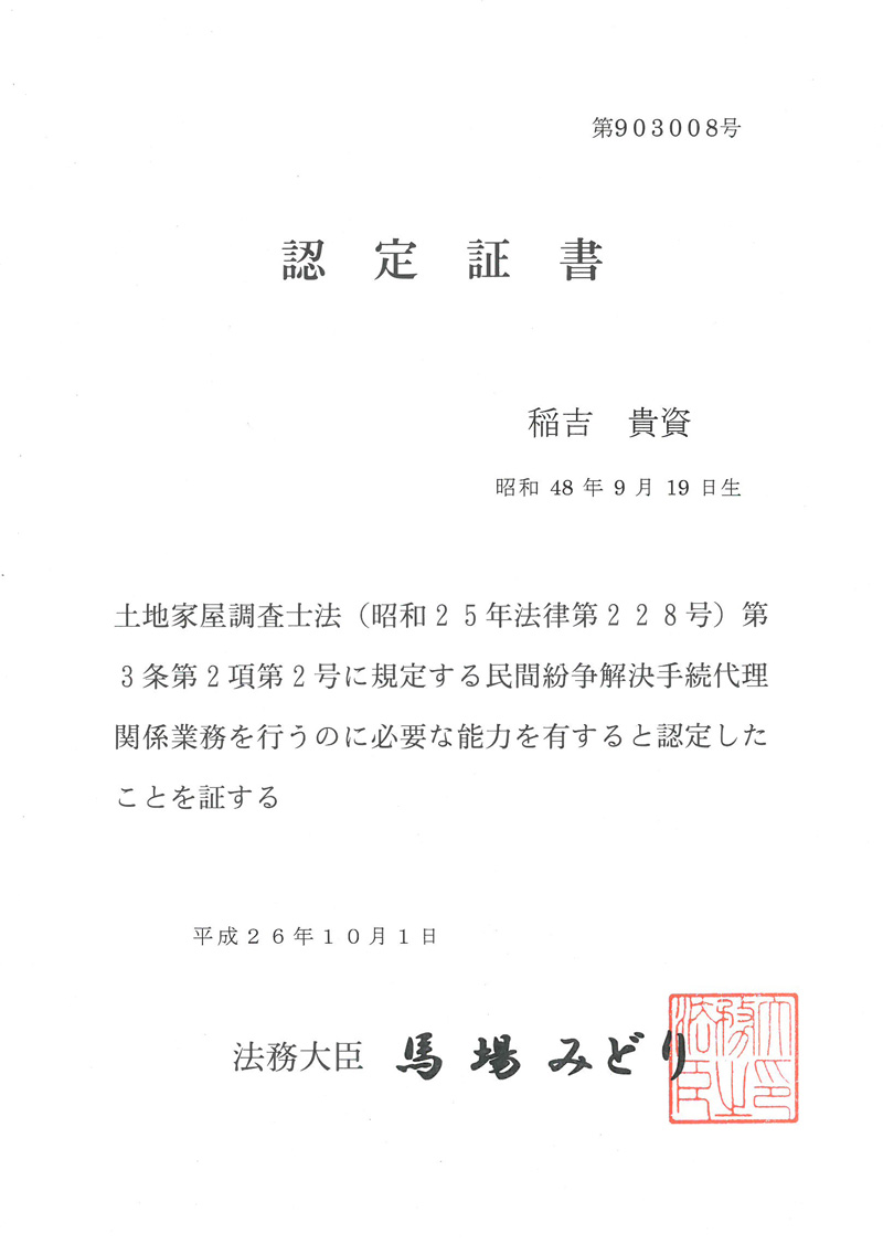 (民間紛争解決手続認定調査士 平成26年 登録番号 903008号)